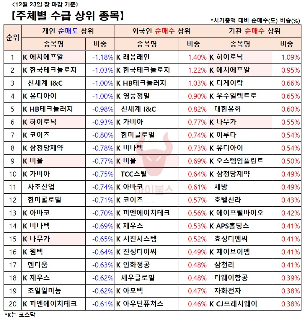 지난 금요일은 대주주 양도세 기준이 결정(이전과 동일하게 10억원)된 후, 첫 거래일이었습니다. 대주주 양도세를 회피하려는 개인 투자자의 매물이 쏟아진 하루였는데, 종목이 나빠서가 아닌, 단순히 세금 문제로 무차별적인 매도를 당한 종목들이 많았습니다. 매년 연말마다 외국인은 이런 개인 투자자의 투매 물량을 저가에 받아갔었습니다. 펀더멘탈이 튼튼하고, 실적이 성장하는 좋은 종목이라면, 양도세 문제에서 자유로워지는 12월 28일부터 큰 손 개인 투자자들이 다시 담아갈 종목들이 있을 겁니다. 개인 순매도 상위 종목과 외국인, 기관의 순매수 상위 종목을 비교해서 보시면 힌트를 얻어가실 수 있을 것 같습니다.